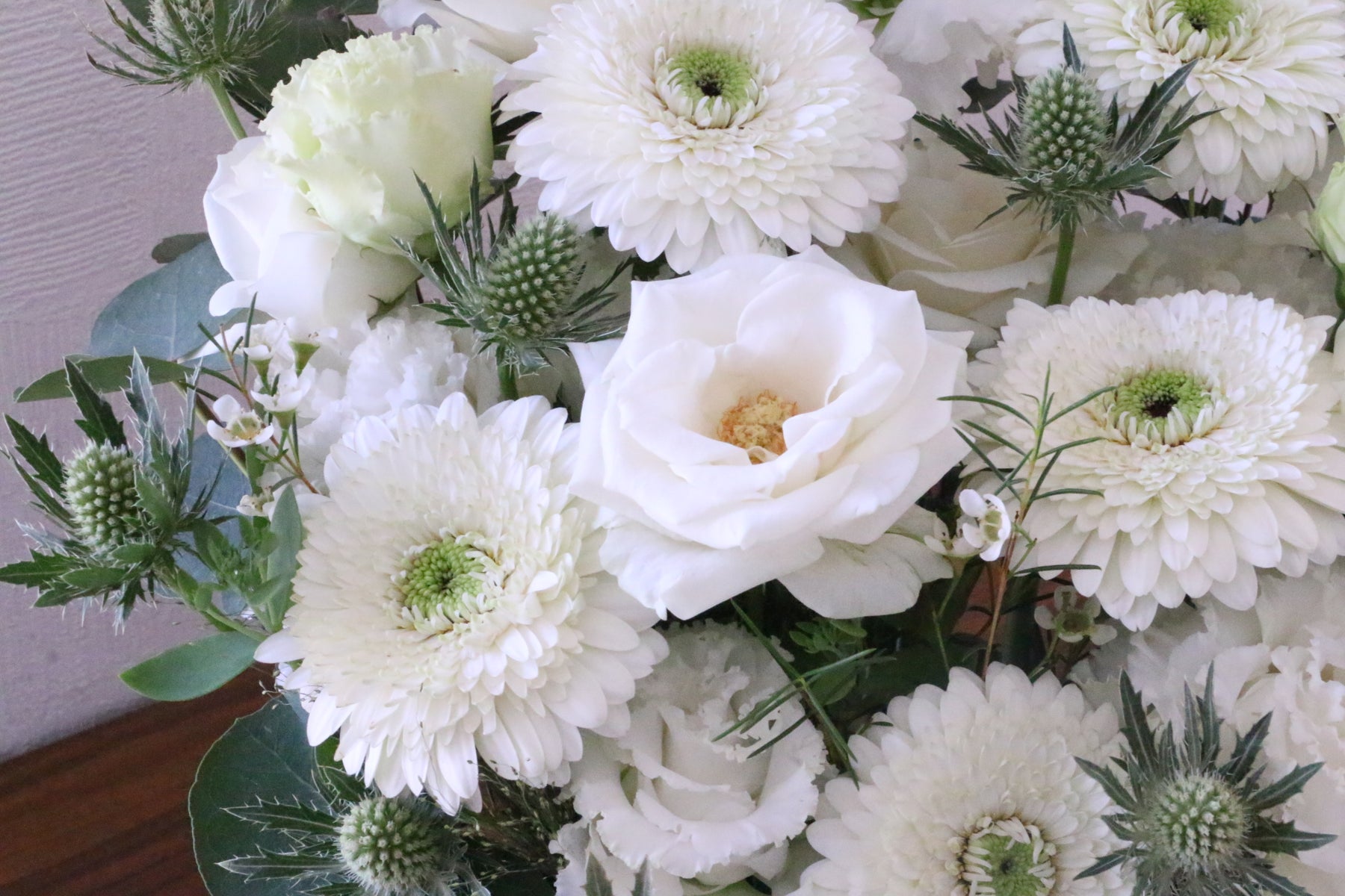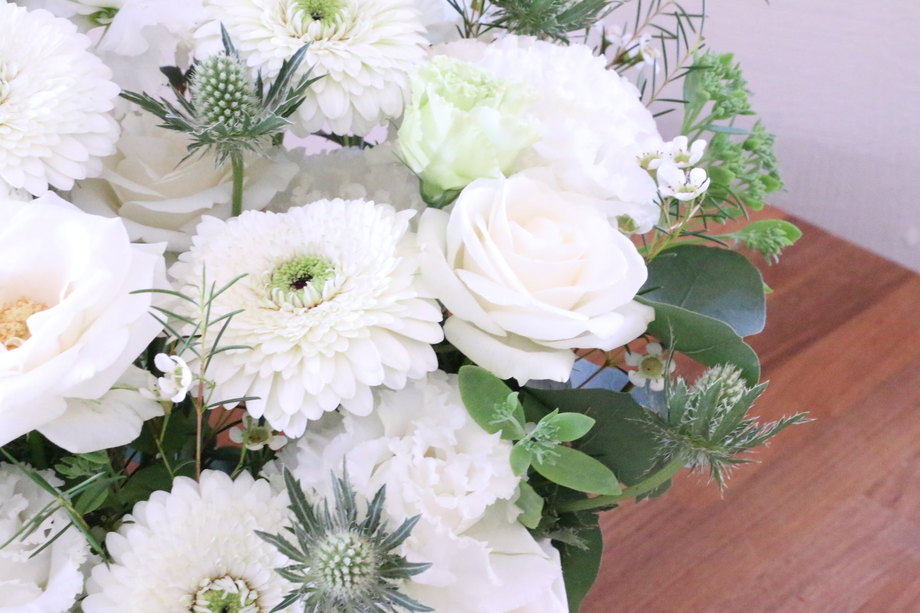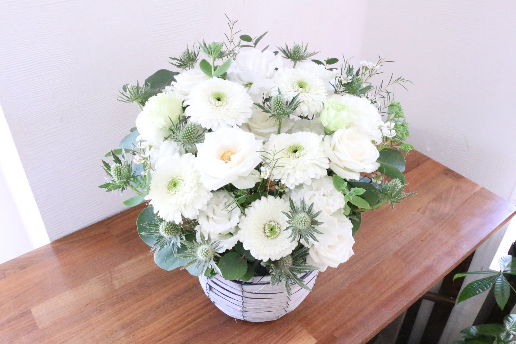 葉物や緑色のお花を入れながら、白色・緑色でまとめます。