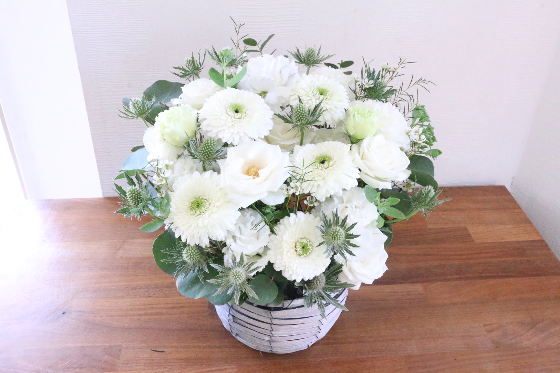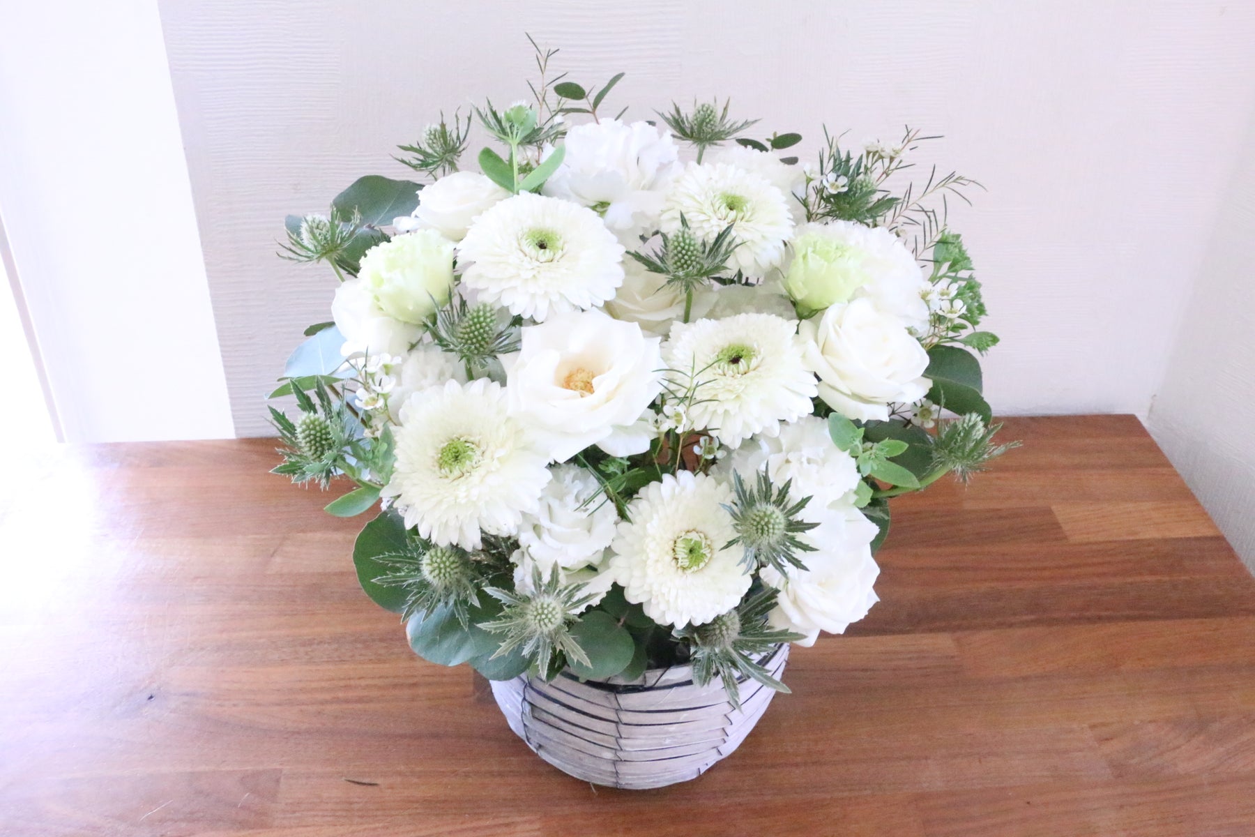 白色のお花をベースに洗練された爽やかな雰囲気で仕上げたアレンジメントです。