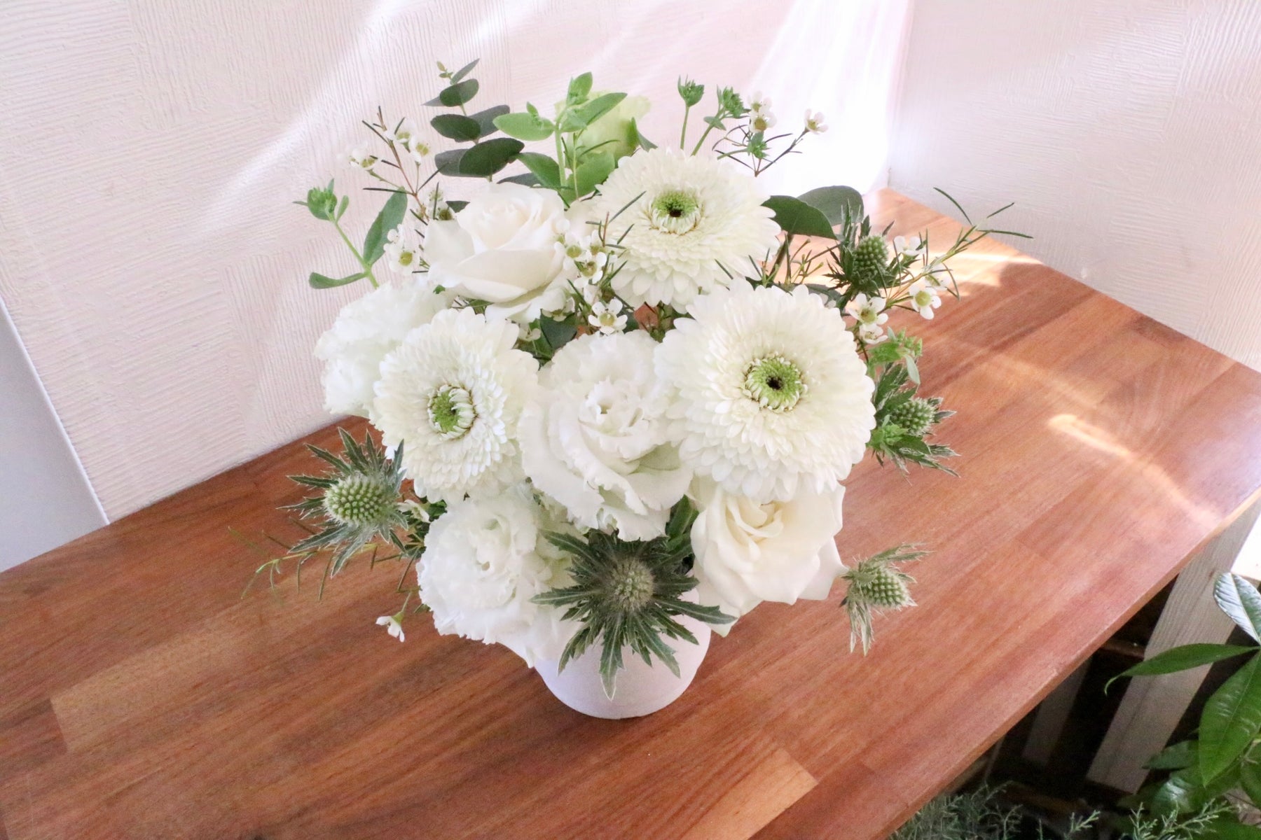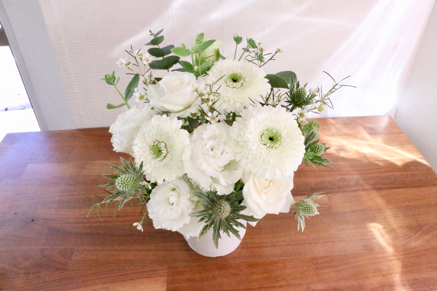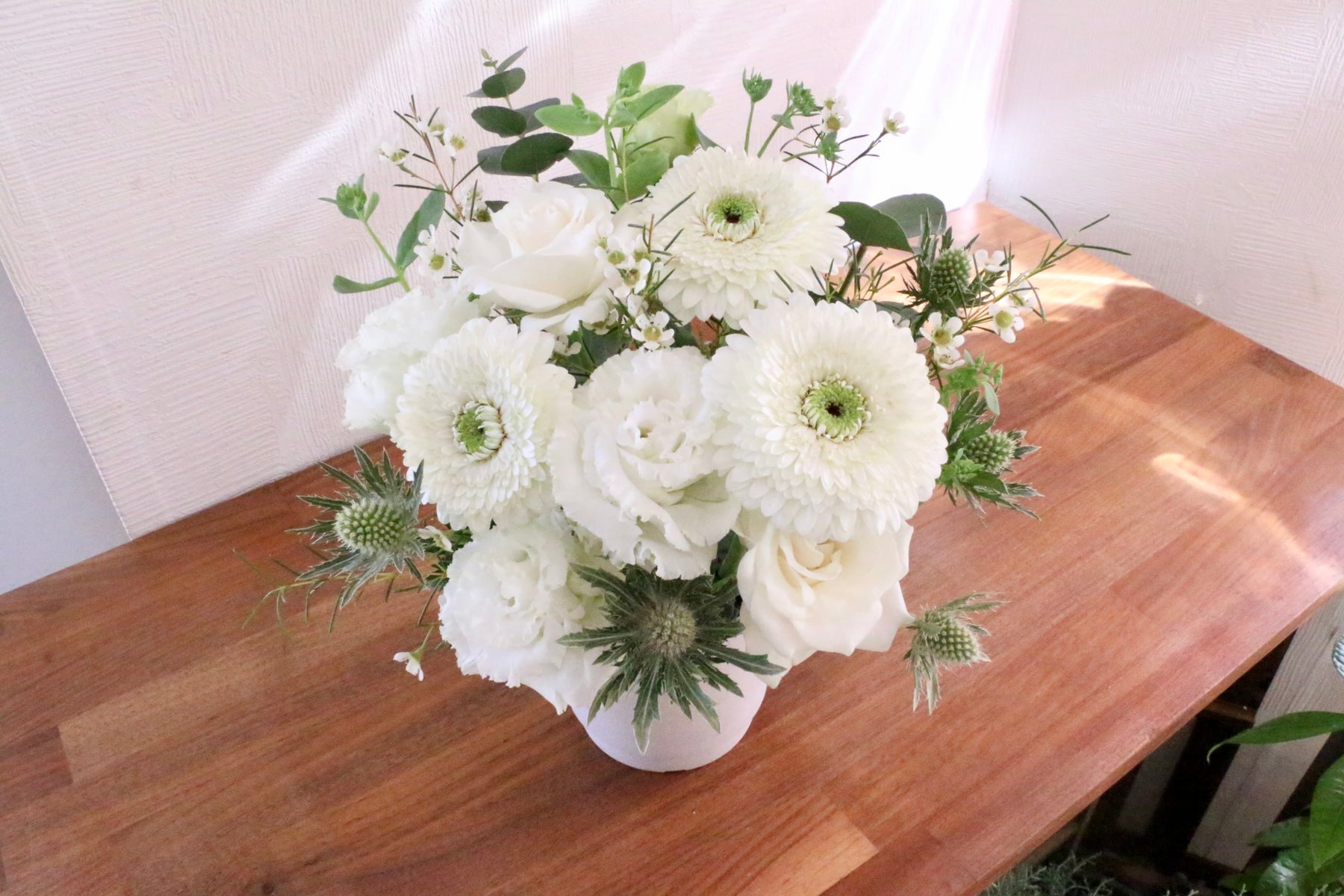 白色のお花をベースに洗練された爽やかな雰囲気で仕上げたアレンジメントです。