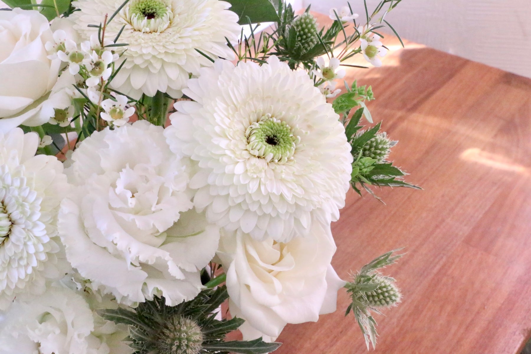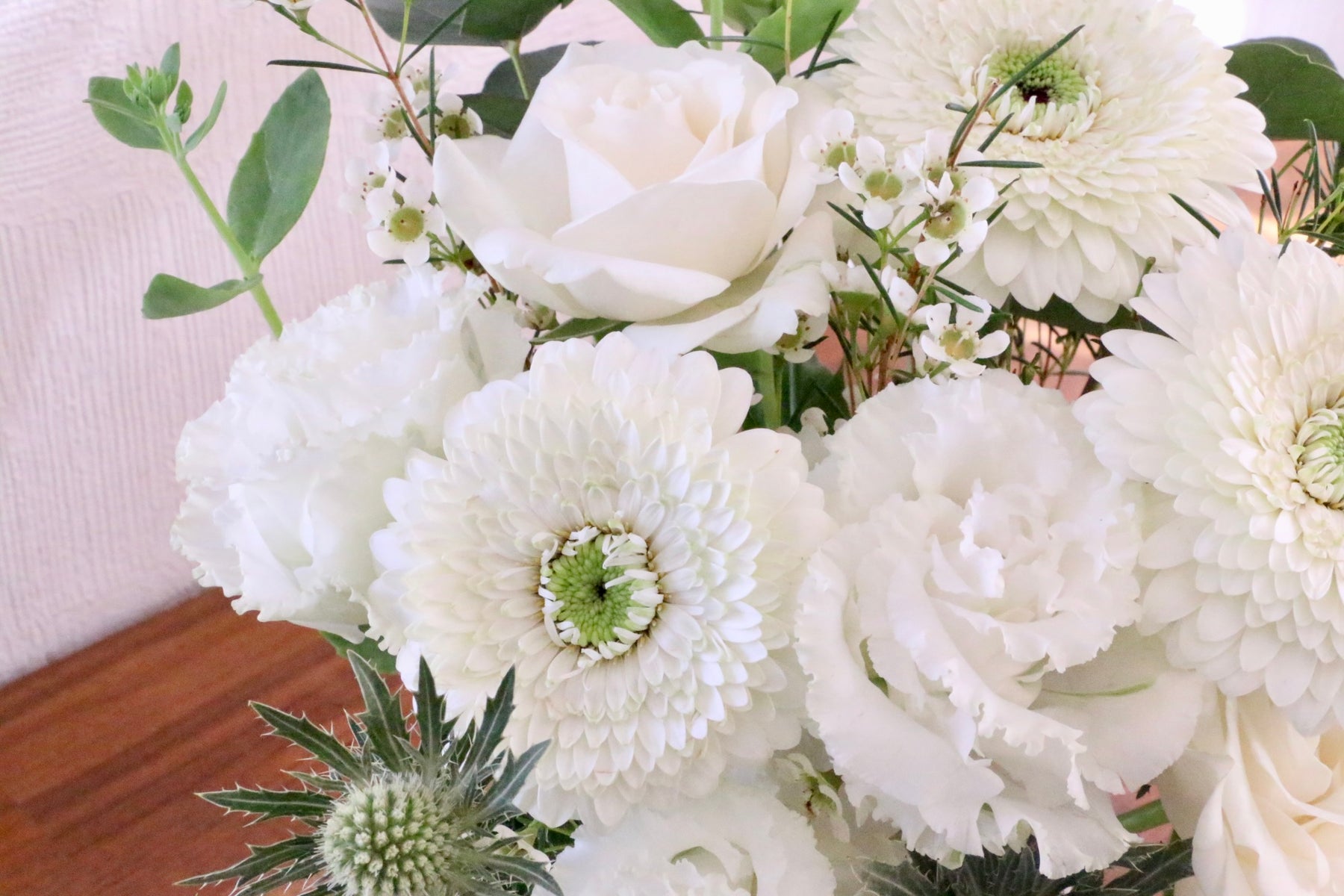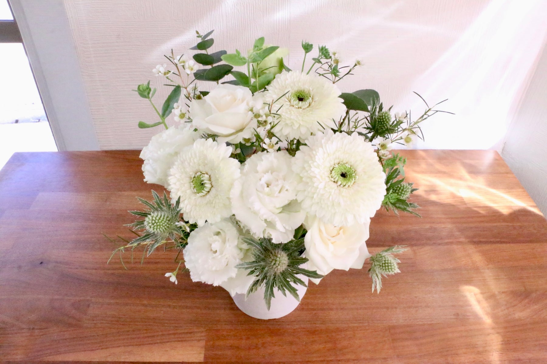 白色のお花をベースに洗練された爽やかな雰囲気で仕上げたアレンジメントです。