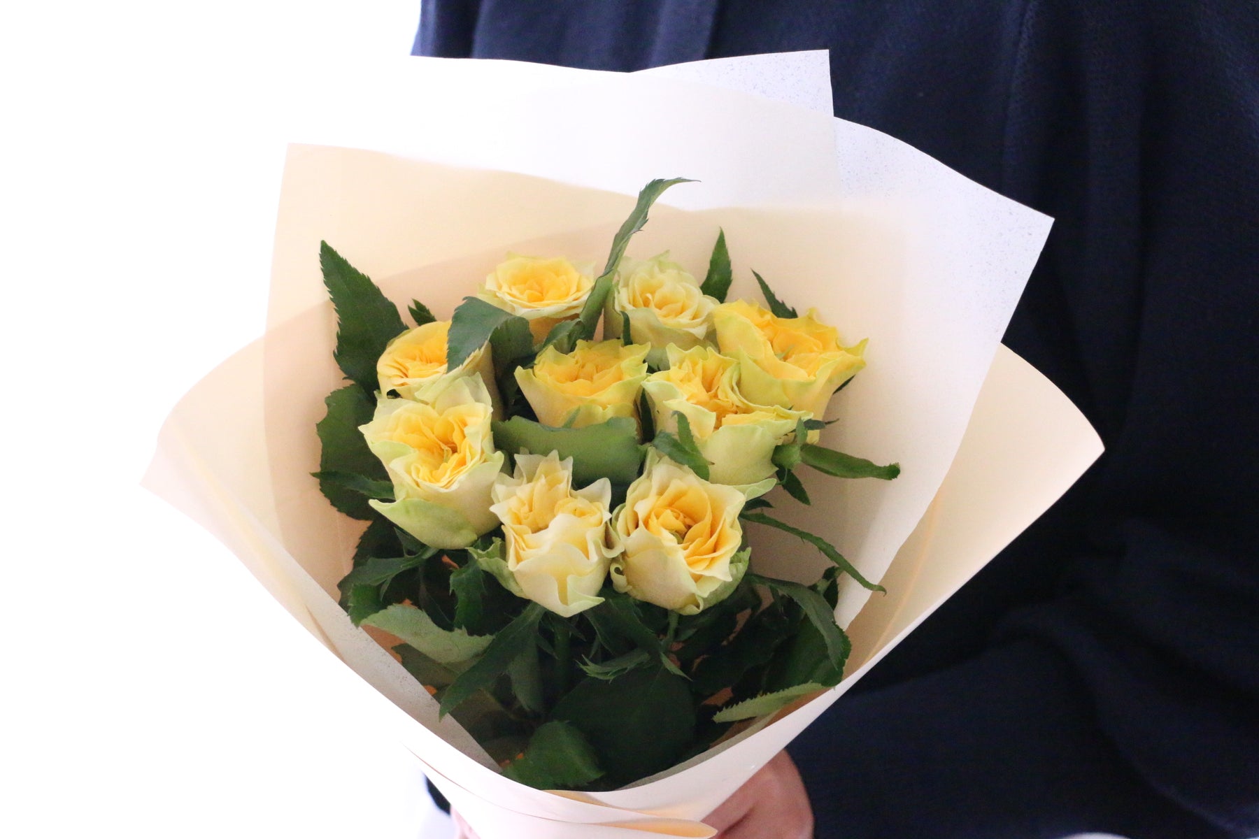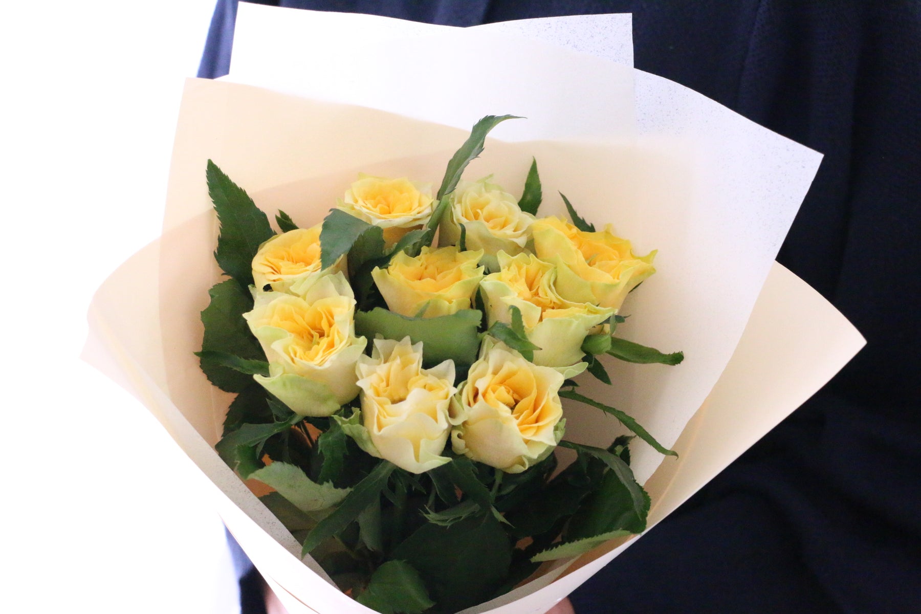 9本の黄色のバラを束ねた花束です。色彩豊かで高貴で華やかなバラは、ギフトに人気のお花です。